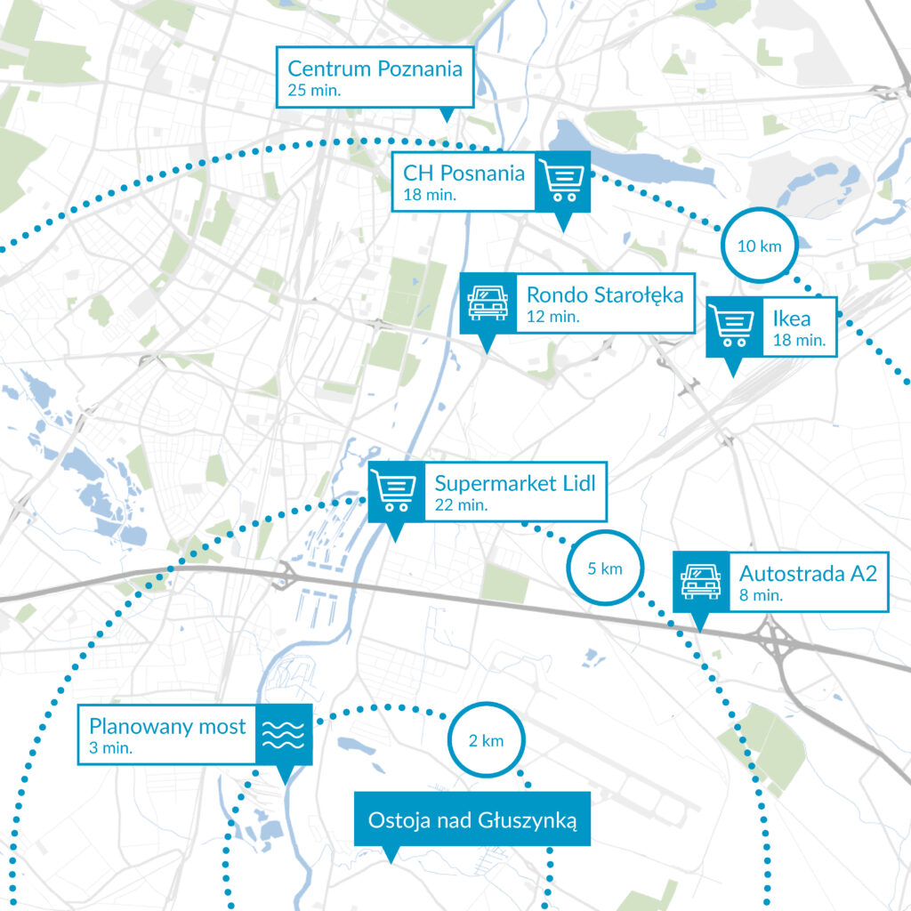 Do ronda Starołęka dojedziesz już w 12 min, a na zakupy do Posnanii lub Ikea w jedyne 18 minut. Lokalizacja ta jest dużym udogodnieniem dla osób pracujących lub uczących się w sercu i w południowych dzielnicach Poznania – niedaleko znajduje się kilka kluczowych ciągów komunikacyjnych. Poruszanie się samochodem po całym regionie usprawni również planowany most, łączący Czapury oraz Luboń. Zwiń ∧